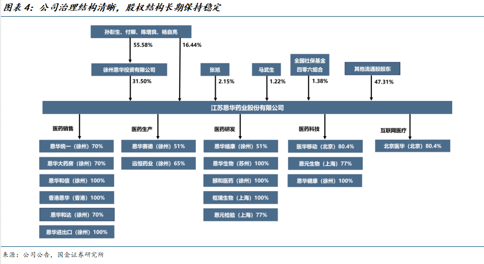 治理结构清晰:公司前身为徐州第三制药厂,改制之后成立恩华股份有限公司。公司实控人孙彭生(董事长)、付卿(董事、副总经理)、陈增良(董事、副总经理)及杨自亮(董事、副总经理)直接和间接控制本公司47.94%的股份,是本公司的实际控制人。公司核心管理层均有基层管理经历、且经验丰富,治理结构长期保持稳定。