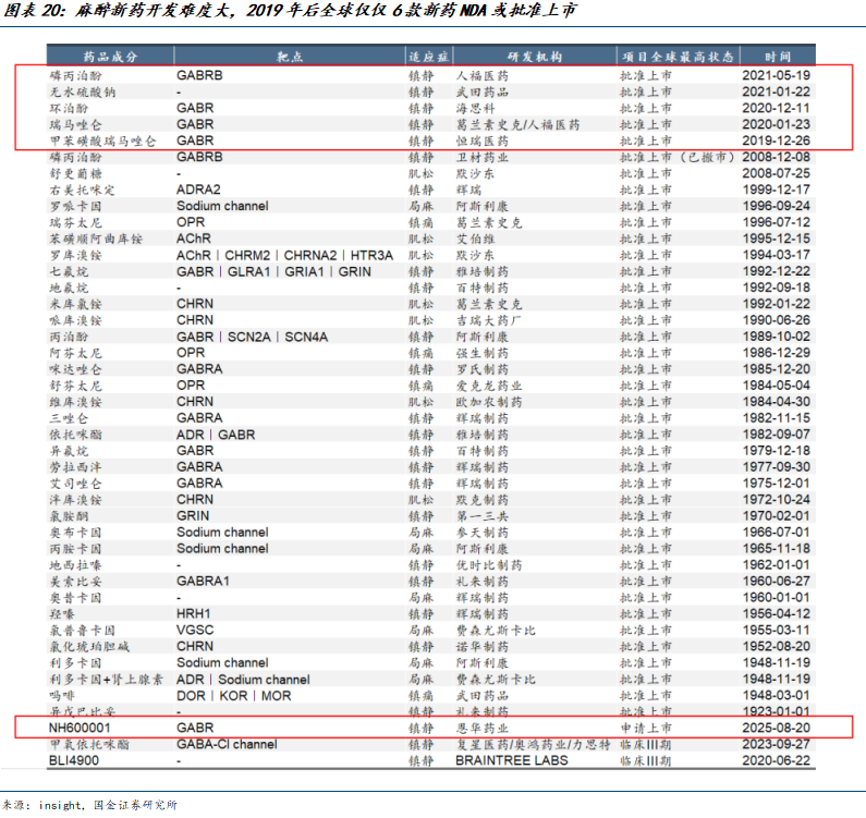 综上,麻醉新药开发壁垒高,给企业带来的难度大。但凭借在中枢神经(CNS)领域长期积累的研发经验,公司顺利推进了NH600001完成Ⅲ期临床并递交上市申请,体现公司在CNS领域强劲的创新实力,也为公司后续CNS的新药研发拉开序幕。