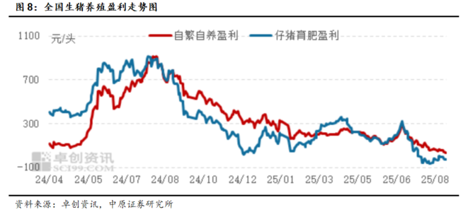 根据卓创资讯数据统计,8月生猪自繁自养理论盈利均值63.70元/头,环比下滑62.51%,同比跌幅92.20%;1-8月均值为189.54元/头,同比下滑32.88%。8月仔猪育肥理论盈利均值-28.35元/头,环比跌122.93%,同比跌103.44%。1-8月均值为157.58元/头,同比下滑64.46%。