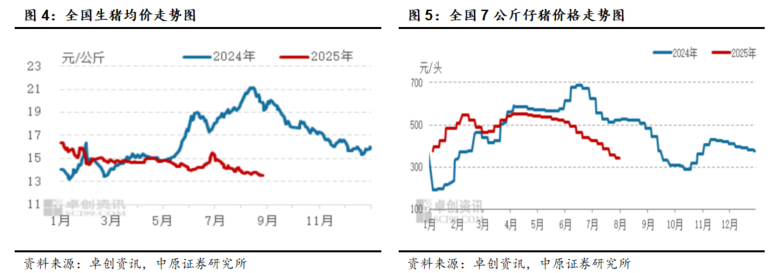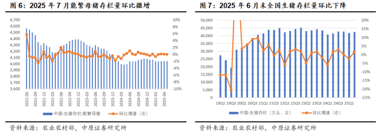根据农业农村部数据,2025年7月末全国能繁母猪存栏量4042万头,同比+0.02%,环比-0.02%,仍高于正常保有量(调整后)142万头;2025年6月末全国生猪存栏4.24亿头,同比增长2.20%,环比增长1.72%,环比由降转增。预计2025年后续能繁产能仍以小幅波动为主。