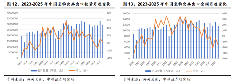根据海关总署数据,2025年8月我国宠物食品出口数量2.95万吨,同比+3.53%;1-8月累计出口23.04万吨,同比+6.22%。以美元计价,2025年8月宠物食品出口金额1.17亿美元,同比-15.86%;1-8月累计出口金额为9.42亿美元,同比-3.33%。