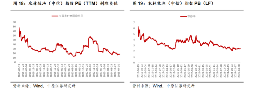 生猪养殖:从产能来看,能繁母猪存栏量和全部生猪存栏量处于较高水平,预计后市能繁产能仍以小幅波动为主,下半年市场生猪供应仍较为充足。从需求端来看,加征美国猪肉关税这一举措或导致进口冻品数量下降,侧面推动国内屠宰量增加,叠加下半年将进入猪肉传统消费旺季,预计2025年下半年行业或进入供需双增的局面。目前,生猪养殖板块仍处于历史估值相对低位,随着宏观调控下产能逐步去化至合理水平,市场供需关系有望进一步改善,行业龙头将率先受益,建议关注牧原股份(002714)。