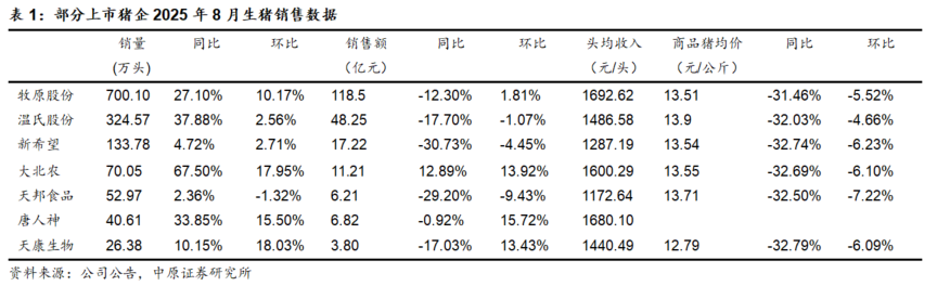 从销售数据来看,2025年8月,受市场行情影响猪企商品猪销售月均价同环比降幅扩大;其中,牧原股份商品猪头均收入相对较高,达到1692.62元/头。从出栏量来看,8月温氏股份、大北农、唐人神出栏量同比增速较高,分别达到37.88%、67.50%、33.85%。