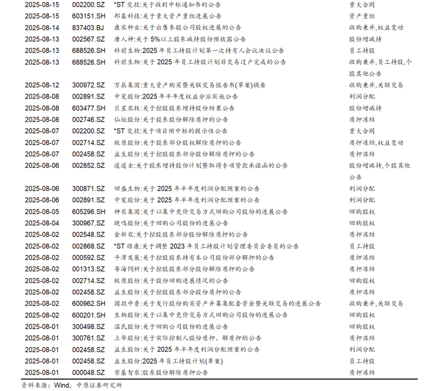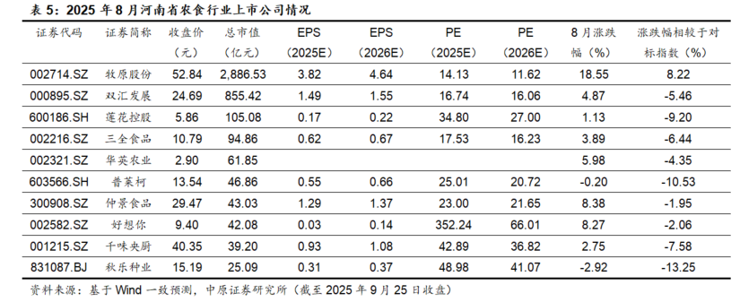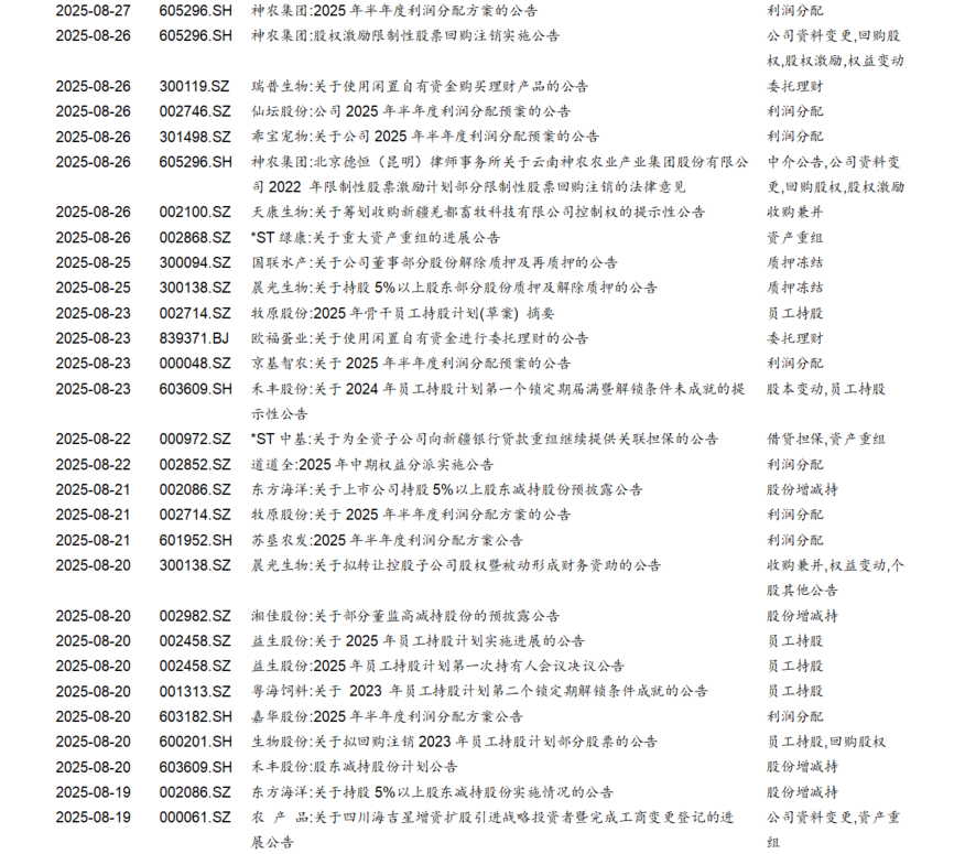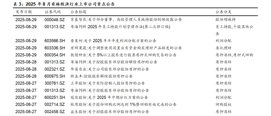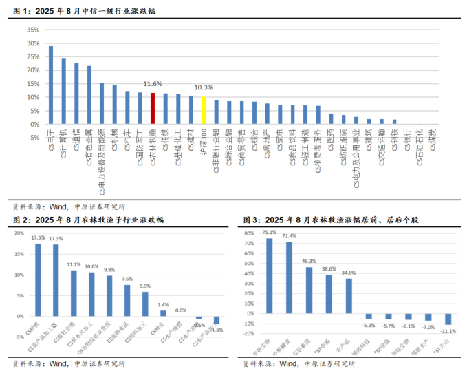 根据Wind数据统计,2025年8月,农林牧渔(中信)指数上涨11.6%,在中信一级30个行业中排第9位;同期沪深300指数上涨10.3%,农林牧渔跑赢对标指数1.3 pcts。
