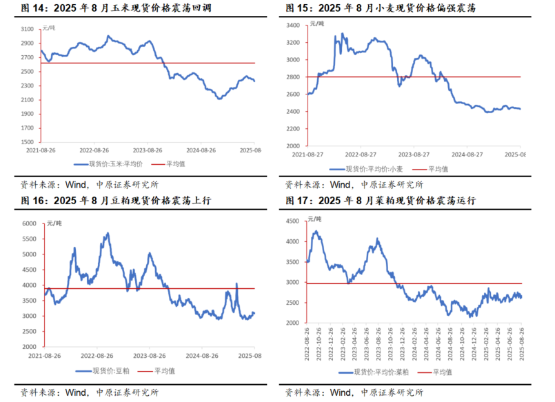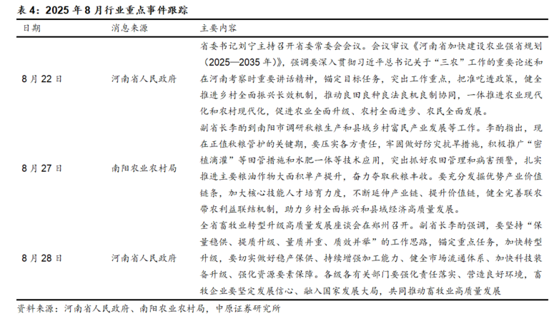 生猪养殖:8月猪价震荡下行。2025年8月全国生猪(外三元)交易均价13.77元/公斤,环比下跌5.36%,同比跌幅32.27%。8月上旬市场处于供过于求态势,猪价快速下行;下旬由于部分地区猪病复发,养殖端出栏节奏加快,市场小体重标猪供应增加,而需求端提振力度有限,导致生猪价格进一步下行。2025年上半年国内二次育肥情况增加,生猪出栏体重有望上升,供应端产能充足,预计2025年下半年行业或进入供需双增的局面。