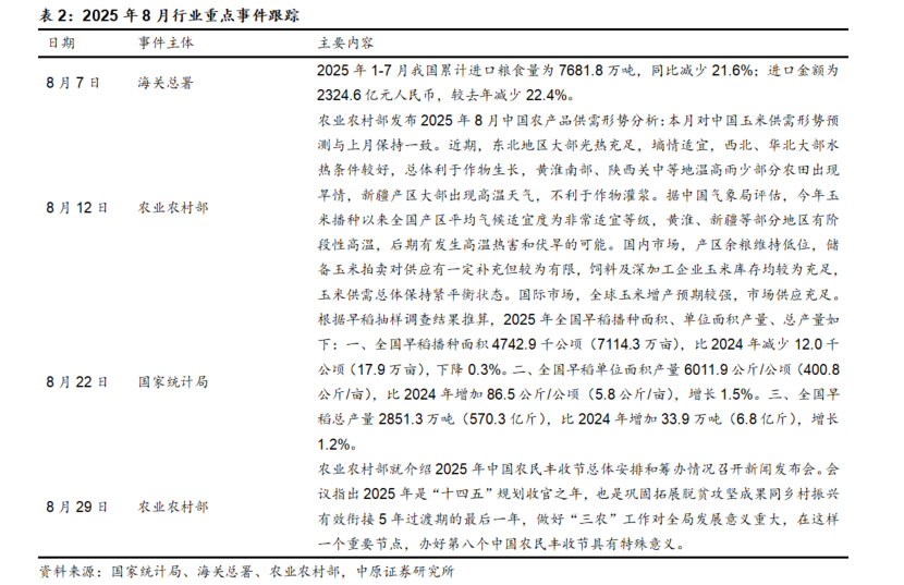 行情回顾:2025年8月农林牧渔行业表现强于对标指数。根据Wind数据统计,2025年8月,农林牧渔(中信)指数上涨11.6%,在中信一级30个行业中排第9位;同期沪深300指数上涨10.3%,农林牧渔跑赢对标指数1.3 pcts。从子行业来看,8月种植板块涨幅居前,水产加工板块跌幅居前。