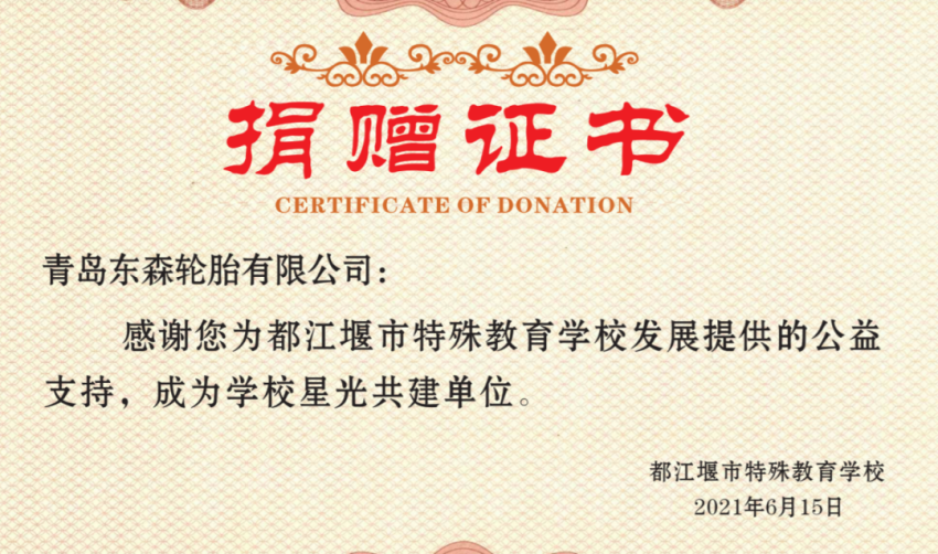 在2021年6月,米其林与合作伙伴共同举办了“都江堰爱心行”活动,东森轮胎积极参与,并前往四川省都江堰市特殊教育学校,捐赠了教育康复设备、办公电脑和学生生活用品,总价值达到92万元。