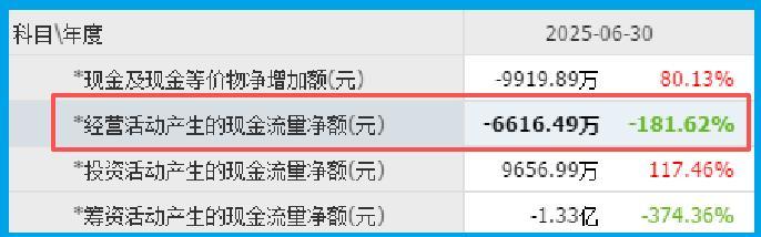 2025年上半年归母净利润5607.9万元,同比增长1.74%;但经营活动现金流净额却是-6616.49万元,同比暴跌182%。