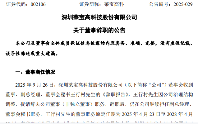 公告内容显示,9月26日莱宝高科董事会收到公司董事、副总经理、董事会秘书王行村先生的《辞职报告》,王行村先生因公司治理结构调整,提请辞去公司董事(非独立董事)职务,辞职后,仍在公司继续担任副总经理、董事会秘书职务。王行村先生的董事职务原定任期为 2025 年4 月23 日至2028年4月22 日,其辞职不会导致公司董事会成员低于法定最低人数。