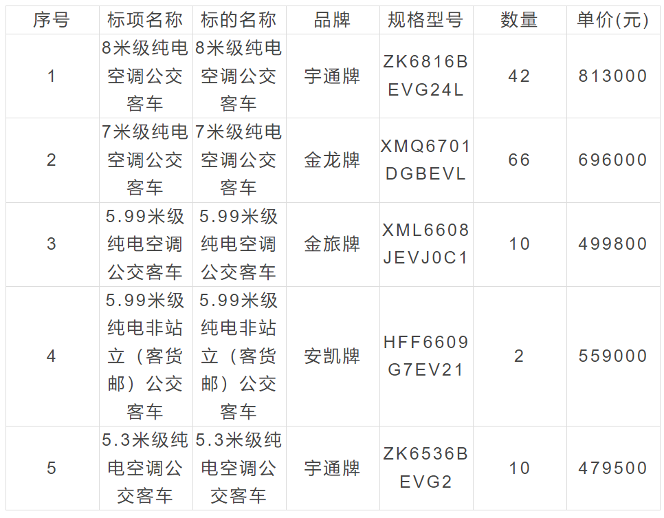 日前,绍兴市公共交通集团有限公司2025年公交客车采购项目中标(成交)结果公告,该项目分为5个标项,共计采购纯电公交客车130辆。中标企业包括:宇通客车股份有限公司、厦门金龙联合汽车工业有限公司、厦门金龙旅行车有限公司、安徽安凯汽车股份有限公司。公告详情如下:
