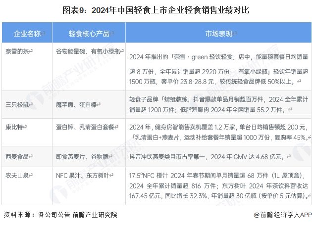 2024年,奈雪的茶轻食产品销量可观且性价比突出,三只松鼠轻食子品牌单品销量亮眼,康比特运动补给套餐销量与复购率良好,西麦食品在抖音冲饮燕麦类目市占率领先。