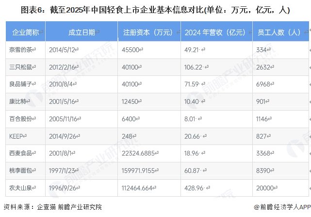 成立时间上,农夫山泉(1996年)成立最早,奈雪的茶(2014年)成立最晚;注册资本方面,桃李面包以159971.9155最高,KEEP以248万元最低;营收方面,农夫山泉2024年以428.96亿元居首,百合股份8.01亿元最低。整体来看,各企业在成立时间、资本规模及营收规模上均存在明显差异。