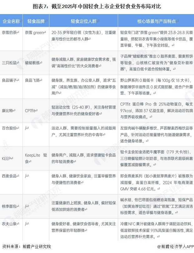 中国轻食上市企业在业务布局上呈现出差异化定位:奈雪的茶、KEEP等聚焦年轻白领与健身人群,通过专门店或联名套餐覆盖全时段轻食需求;三只松鼠、良品铺子以子品牌推出低卡零食,瞄准大众健康饮食市场;西麦食品、桃李面包则依托现有产品特性,满足健身人群的营养补充与便捷饮食需求;康比特、百合股份、农夫山泉则针对运动人群,提供有助于身材管理和运动后营养吸收的轻食产品。