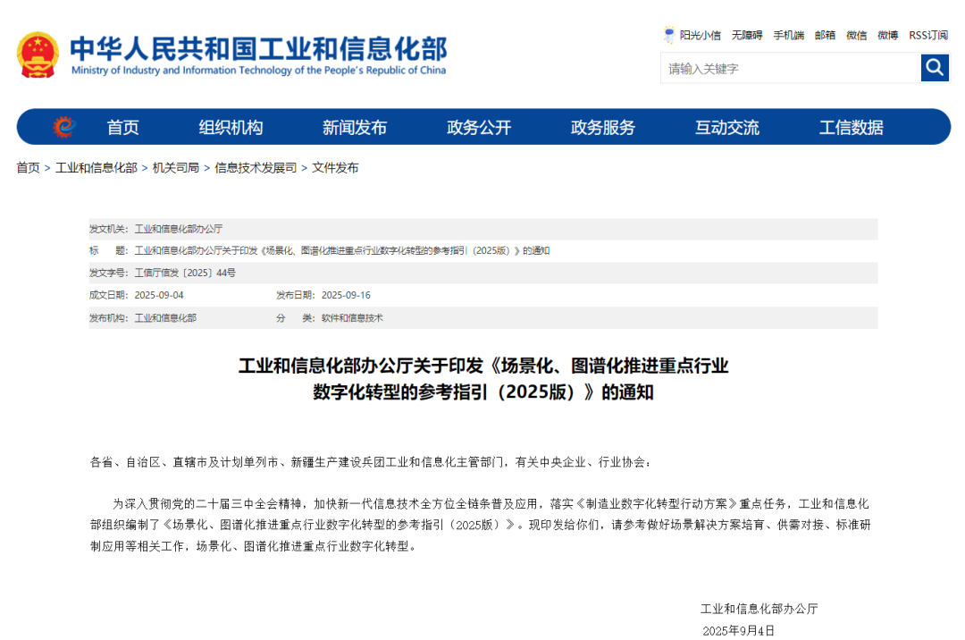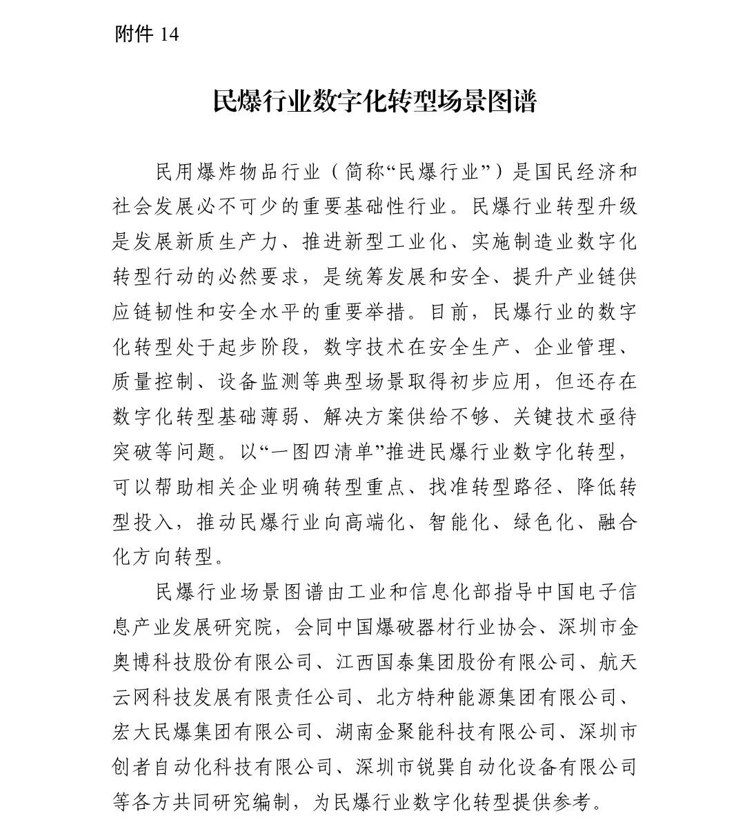 2025年9月,工业和信息化部办公厅正式印发《场景化、图谱化推进重点行业数字化转型的参考指引(2025版)》(工信厅信发〔2025〕44号),这份文件不仅是国家推动制造业数字化转型的重要政策抓手,更首次为包括民爆在内的14个重点行业,提供了兼具指导性和可操作性的数字化转型“路线图”,填补了行业转型过程中“方法论”的关键空白。