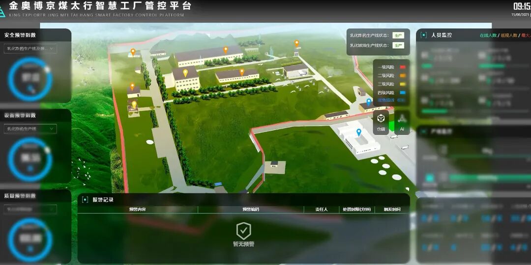 金奥博自主研发的“工业互联网+安全生产”系统基于智能装备、感知设备和数字孪生等核心技术,构建了覆盖生产管控、AI视觉识别、智能安防、智能仓储及智能巡检的智能化管理体系。