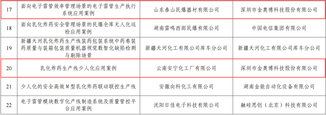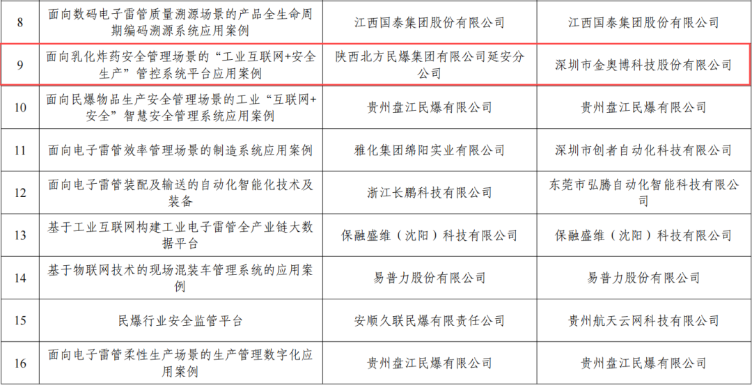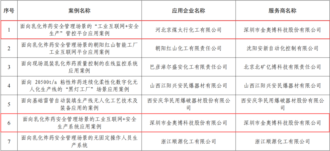 此前,金奥博已有5个应用案例成功入选民用爆炸物品行业重点场景数字化转型典型案例名单,涵盖了民爆生产、安全监管、智能物流等多个关键领域。