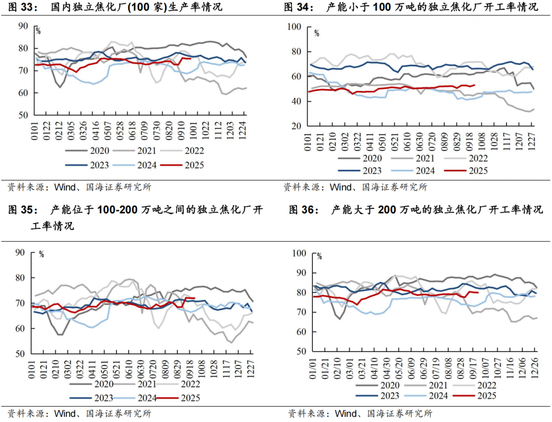 本周焦化厂生产率环比分化:截至9月26日,国内独立焦化厂(100家)焦炉生产率75.29%,周环比下降0.0个pct,产能小于100万吨的焦化企业(100家)开工率52.96%,环比上涨1.1个pct,产能在100-200万吨的焦化企业(100家)开工率71.87%,环比下降0.0个pct,产能大于200万吨的焦化企业(100家)开工率79.9%,环比下降0.1个pct。