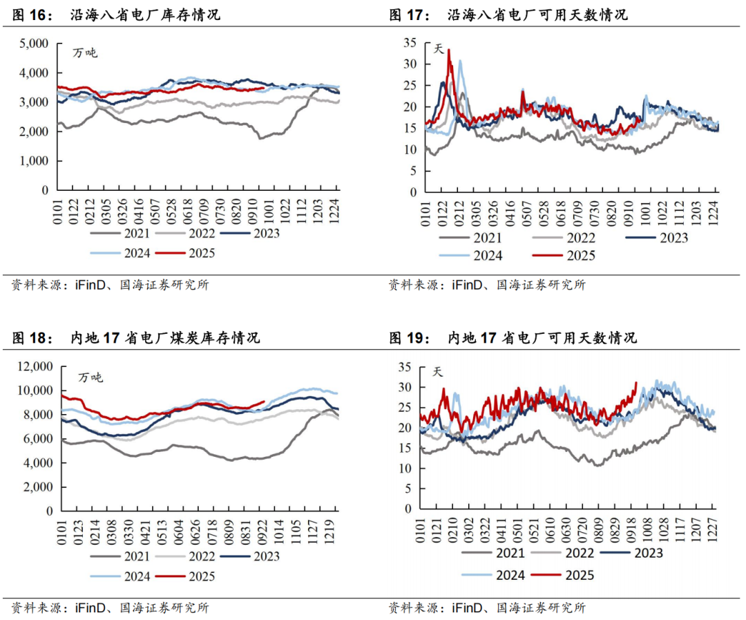 本周沿海八省电厂煤炭库存上升,可用天数环比上升:截至9月24日,沿海八省电厂煤炭库存量为3475.5万吨,周环比上升32.1万吨,可用天数为16.8天,周环比上升1.6天。