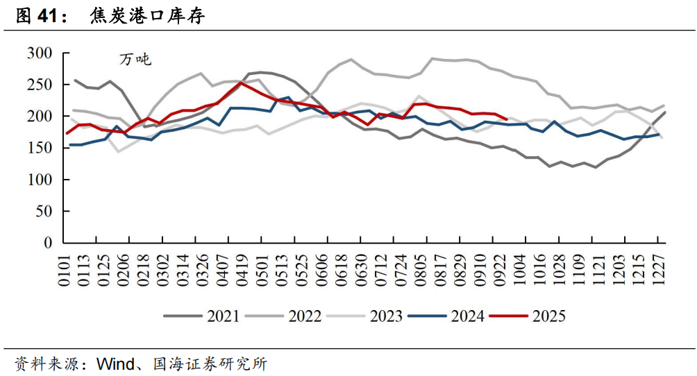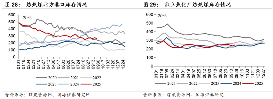 本周炼焦煤北方港口库存环比下降:截至9月26日,炼焦煤北方港口库存为257.95万吨,周环比下降15.7万吨。