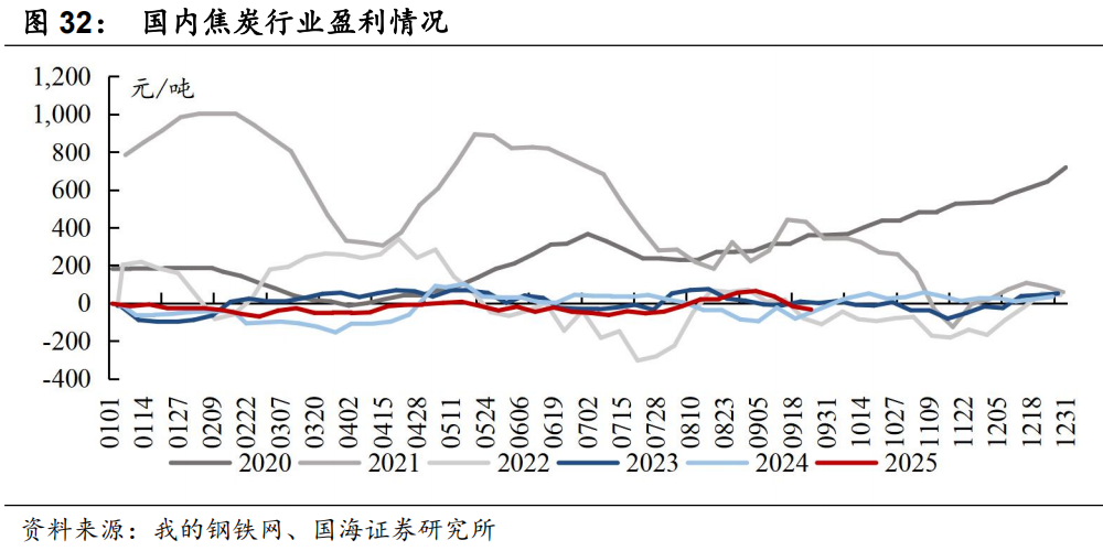 本周国内焦炭行业盈利环比下降:截至9月25日,全国平均吨焦盈利约为-34元/吨,周环比下降17元/吨。