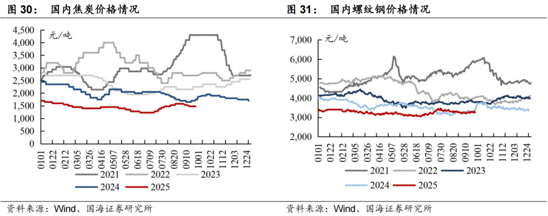 炼焦煤和焦炭来看,对于炼焦煤,9/17-9/24,样本煤矿产能利用率环比上升0.44pct至86.8%,主要系山西地区个别因前期井下因素停产的煤矿恢复正常所致。蒙煤方面,甘其毛都口岸通关车数维持千车以上高位运行,本周甘其毛都口岸平均通关量为1,300车(七日平均值),周环比下降20车。需求端,铁水产量本周环比上升1.33万吨,刚需有支撑,焦化厂方面,焦企补库基本结束,前期订单持续拉运到货。库存端,在下游补库之下,本周焦煤生产企业库存环比去化16.44万吨。整体来看,国内生产温和恢复,但在刚需尚可、节前部分补库需求释放等因素影响下,焦煤生产企业库存环比去化16.44万吨,煤价提升,截至9月26日港口主焦煤1,750.00元/吨(周环比+80.00元/吨),后续上行驱动预计在补库结束、铁水已处高位下略有弱化,煤价短期维持震荡趋势,关注煤矿复产情况、钢材旺季需求表现等因素。对于焦炭,供给端,焦煤价格上涨推升焦炭成本,利润影响下部分焦企生产承压,开工率小幅下滑,本周焦企产能利用率环比小幅下降0.06pct至75.01%。需求端,铁水产量本周环比上升1.33万吨,刚需支撑叠加节前钢厂补库需求增加,焦企出货整体较为顺畅,本周独立焦化厂焦炭库存环比下降。整体来看,目前焦炭供需矛盾不大,预计价格维持震荡走势,后续关注上游煤价情况、焦炭提涨落地情况以及铁水产量、钢厂利润情况等因素。