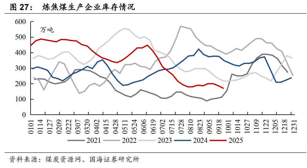 本周炼焦煤生产企业库存环比下降:截至9月24日,炼焦煤生产企业库存量为170.1万吨,周环比下降16.4万吨。