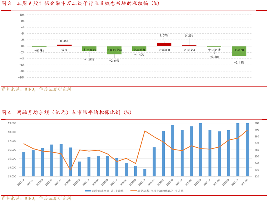 非银及子板块的指数表现:本周(2025.9.21-2025.9.27)非银金融申万指数下跌0.09%,跑输沪深300指数1.16个百分点,位列所有一级行业第9名。细分板块来看,证券板块下跌0.18%、保险板块上涨0.46%、多元金融下跌1.51%、互联网金融下跌2.64%、金融科技下跌1.49%。湘财股份(+16.87%)、国盛金控(+8.46%)、四川双马(+5.33%)、*ST仁东(+4.85%)、越秀资本(+4.47%)涨幅靠前;建元信托(-5.59%)、渤海租赁(-5.42%)、天风证券(-4.60%)、太平洋(-4.50%)、中银证券(-4.42%)跌幅靠前。