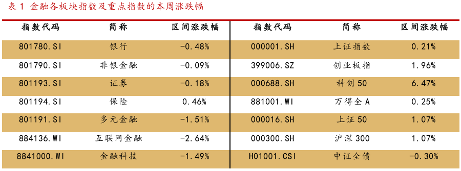 自营业务:本周沪深300指数上涨1.07%,中证全债(净价)指数下跌0.30%。上证指数上涨0.21%、创业板指上涨1.96%、科创50上涨6.47%、万得全A上涨0.25%。