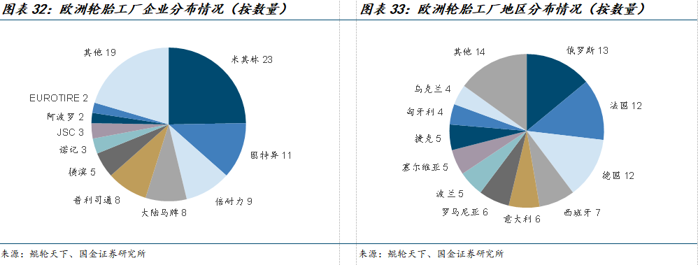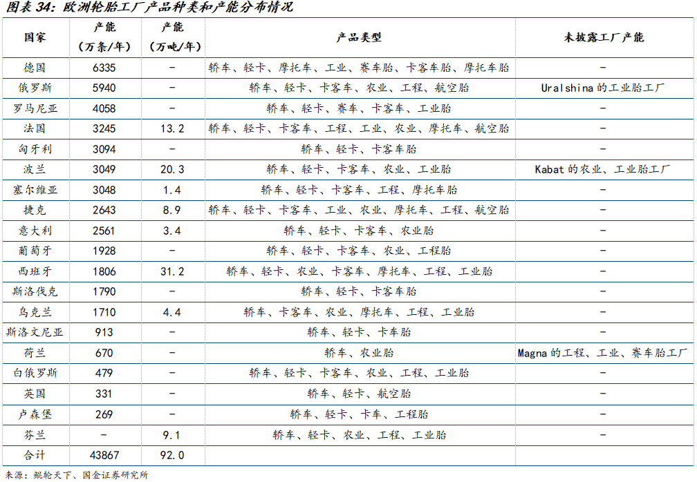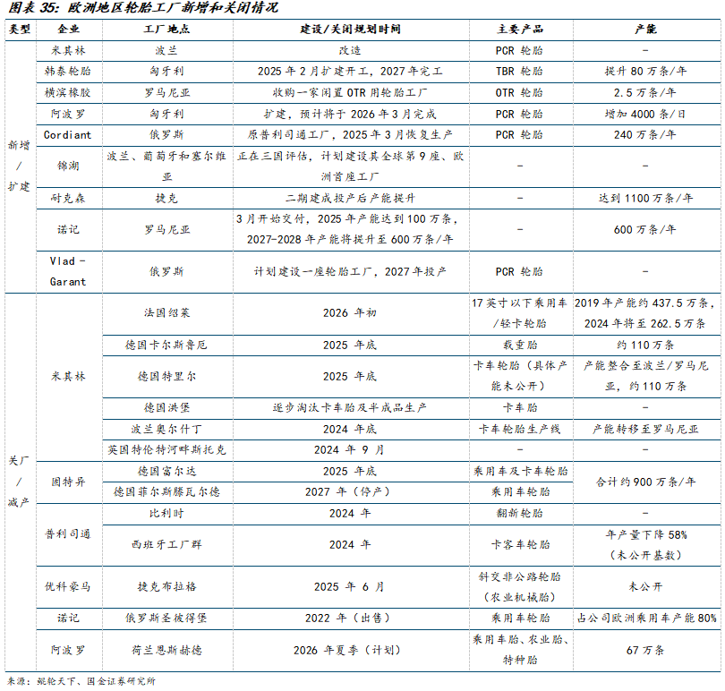 欧洲轮胎市场需求具备支撑,新增产能有限且扩产周期相对较长。从全球轮胎市场分布来看,2024年欧洲乘用车胎需求为4.8亿条,占比高达29%;卡客车胎需求量为3150万条,占比为15%。根据鲲轮天下统计数据,2024年欧洲累计有93个轮胎工厂,包含29个品牌且以海外企业为主,主要分布在俄罗斯和德国法国等地区。从欧洲轮胎产能的变化趋势来看整体产能增量有限,众多海外胎企的欧洲工厂均有关停或减产的规划,新建或扩产项目大多位于东欧地区,结构上呈现出向东部转移的趋势。
