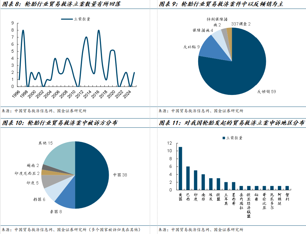 轮胎行业的贸易救济案件类型以反倾销为主,我国为主要被诉方。根据中国贸易救济信息网中的案件披露数据统计,1996年至今轮胎行业发生的贸易救济累计案件为76起,尤其在2012-2020年期间争端频发,累计贸易救济立案数量达到39起,其中单年度立案数量最多的为1997年和2016年,1997年是由于南非对多个国家发起客车轮胎的反倾销调查,2016年则是因为美国对我国、印度等地多个产品发起反倾销和反补贴调查。从轮胎行业贸易救济案件类型来看,反倾销为主要类型,累计59起,占比达到78%;其次为反补贴,累计有9起,占比为12%。从轮胎行业中的被诉方分布情况来看,我国单独被诉的案件数量有38起,占比达到50%,此外还有4起保障措施和1起337调查案件涉及到多个国家和地区,也包含我国企业。
