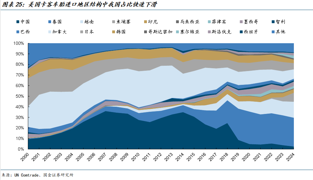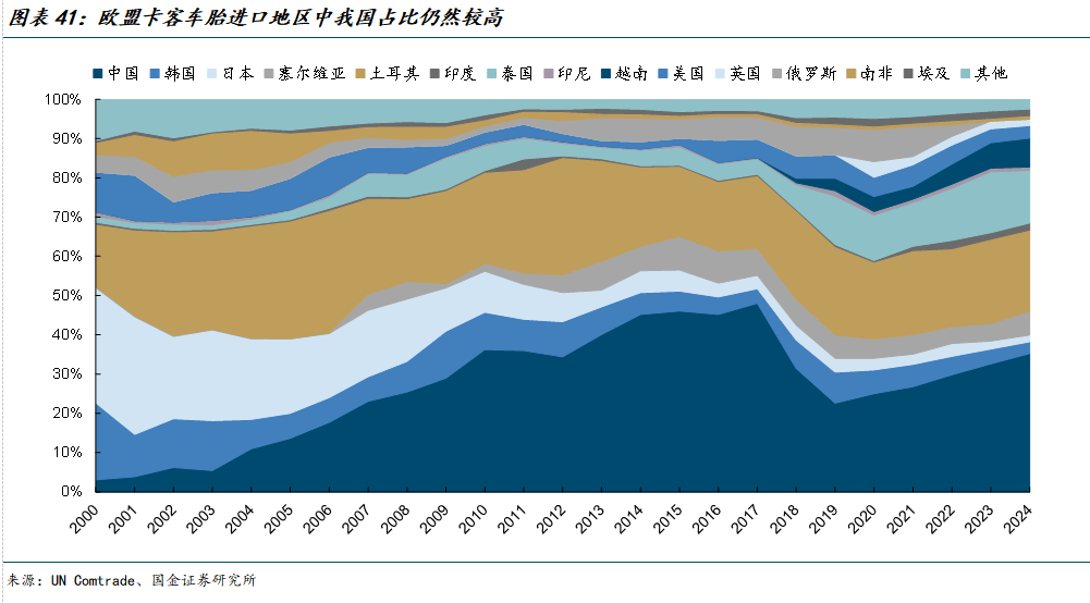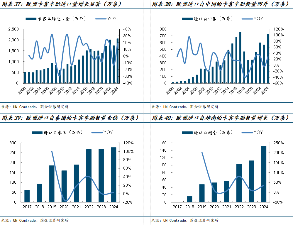 欧盟卡客车轮胎进口需求呈现增长态势,中国轮胎进口占比随贸易政策变化出现波动。从欧盟过去20年的进口趋势来看,2016年之前呈现出稳步增长的趋势,2016-2019年期间进口量在1500万条左右波动,2020年在英国脱欧的背景下进口量显著回落后再次步入增长期,从2020年的1380万条提升至2024年的2058万条,年均复合增速为11%。从欧盟对我国卡客车胎实施双反税率的时间线来看,随着2018年双反税令的实施,当年进口自中国的卡客车胎同比下滑38%至467万条,2019年时继续下滑27%至339万条;由于2020年初至2021年初本案程序暂缓,叠加2022年双反税令撤销,进口自中国的卡客车胎数量开始回升,2024年进口自中国的卡客车胎数量同比增长28%至726万条。从欧盟卡客车胎进口量地区占比来看,2017年时进口自中国的占比高达48%,在双反税影响下占比在2019年下滑至23%,后续随着相关税令的暂缓实施和撤销,进口自中国的占比在2024年回升至35%。与此同时,随着头部轮胎企业东南亚基地产能爬坡放量,欧盟进口自泰国和越南的卡客车胎占比也显著提升,其中欧盟进口自泰国的卡客车胎数量从2018年的93万条提升至2024年的277万条,占比也从6%提升至13%;欧盟进口自越南的卡客车胎数量从2018年的16万条提升至2024年的152万条,占比从1%提升至7%;中国、泰国和越南三国的进口占比在2017年时达到了52%,虽然在双反影响下阶段性回落至2019年的38%,但随着头部胎企出海布局的推进,三国进口占比在2024年时已经回升至56%。