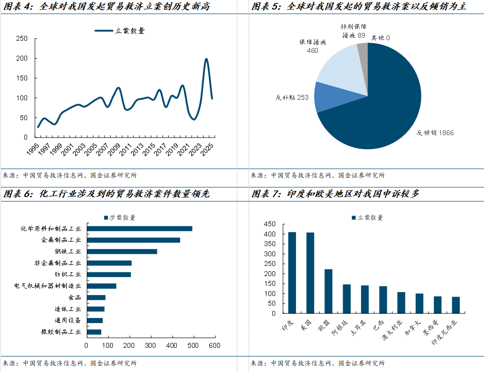 化工行业涉案数量领先,印度和欧美地区对我国发起贸易救济案件较多。从涉及行业来看,1995年至2025年,全球对我国贸易救济案件排名前三的行业分别为化学原料和制品工业(491起,占比为18%),金属制品工业(434起,占比为16%),钢铁工业(327起,占比为12%)。过去30年期间,全球对我国贸易救济案件中,排名前三的申诉国家/地区分别为印度(409起,占比为15%)、美国(407起,占比为15%)、欧盟(222起,占比为8%)。