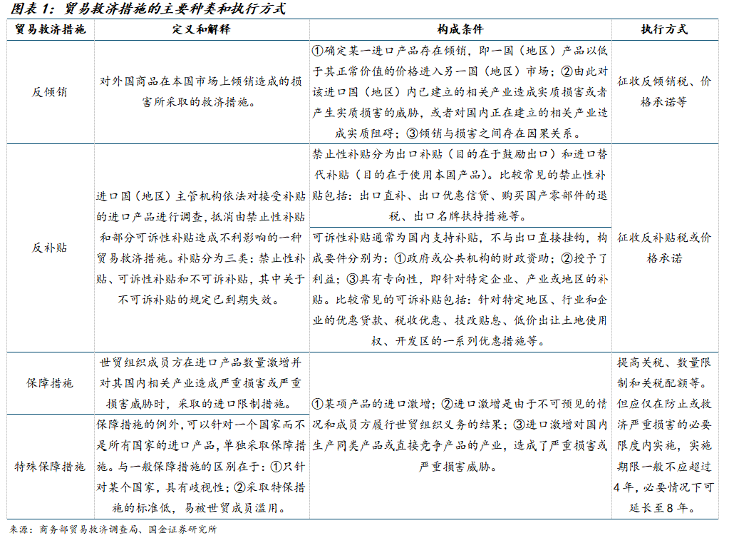 贸易救济措施是指为维护公平贸易和正常的竞争秩序,世贸组织允许成员方在进口产品倾销、补贴或过激增长等给国内产业造成损害的情况下,使用反倾销、反补贴和保障措施等手段,对国内产业进行救济的措施。反倾销和反补贴针对的是存在倾销和补贴的不公平贸易行为,纠正的是企业的价格歧视以及由于政府或公共机构的补贴而使其出口产品获得的不公平竞争优势;保障措施是针对进口激增的情况而采取的紧急进口限制措施,是成员方履行义务时的“例外条款”和“安全阀”。成员方实施贸易救济措施均要经过立案调查,所采取的措施均包括征收特别关税,反倾销和反补贴措施还可以实施价格承诺,保障措施还可以实施进口数量限制。