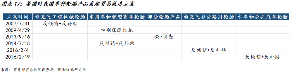 美国对我国轮胎多次发起双反调查,相关贸易政策限制影响延续至今。自2007年开始美国陆续对我国轮胎发起贸易救济立案调查,贸易救济措施以反倾销和反补贴为主,此外还在2009年对乘用车和轻型货车轮胎发起过特别保障措施,2013年对部分轮胎产品发起过337调查。从时间线来看,2013-2016年期间发起的调查立案数量较多,其中2014年对乘用车和轻型货车轮胎发起双反调查,2016年陆续对非公路用轮胎、卡车和公用汽车轮胎发起双反调查。从市场需求容量角度来看,乘用车胎和卡客车胎为两大核心的轮胎产品类型,美国对我国轮胎发起的双反调查也切实影响了我国轮胎的对外出口走向。