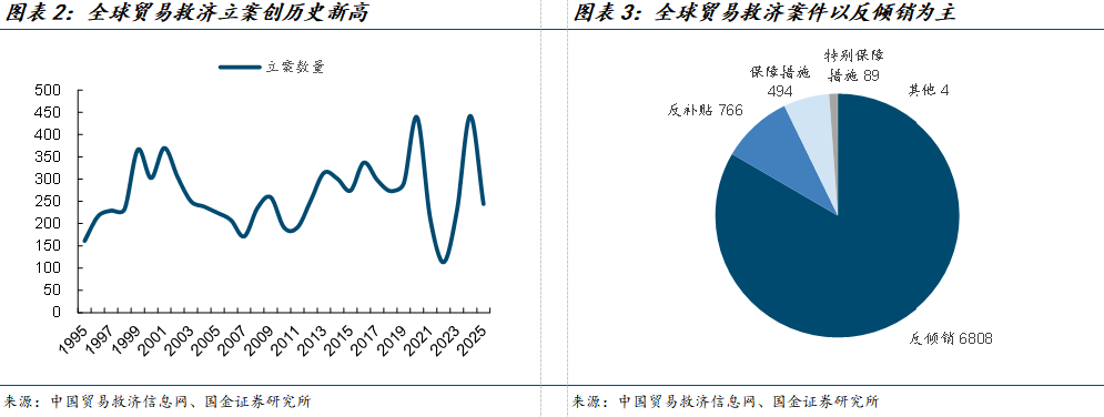 全球贸易冲突不断发生,反倾销案件占比最高。在1995年至2025年期间,全球发起的贸易救济案件中,反倾销6808起,占比83%;反补贴766起,占比9%;保障措施494起,占比6%;特别保障措施89起,占比1%。从立案趋势来看,过去30年期间,全球发起贸易救济原审立案累计超过8000起,其中2024年共442起,同比增速为93%,立案数量创历史新高,也能反映出近几年全球贸易形势变得再次紧张的状态。
