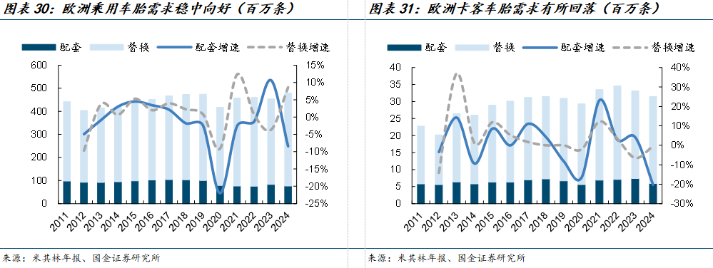 乘用车胎需求支撑相对更强,结构上看替换消费为核心市场。从欧洲轮胎需求的变化情况来看,2016-2024年期间整体需求基本在5亿条左右波动,除了2020年出现阶段性回落。乘用车胎需求自2016年开始基本维持在4.5亿条以上,其中配套市场需求在2016-2019年期间维持在1亿条以上,2020年至今维持在8000万条左右波动,替换市场呈现出波动增长的态势,2024年突破4亿条,同比增长8.6%;卡客车胎需求量自2016年开始基本维持在3000万条以上,其中配套市场波动性明显,2024年需求量下滑至600万条以下,同比下滑幅度为20%,替换市场自2021年开始需求一直维持在2500万条以上。从需求结构上来看,替换市场占比较高,2024年乘用车胎替换市场占比为84%,卡客车胎替换市场占比为81%。