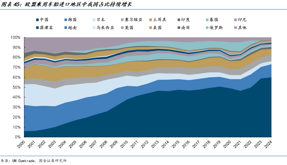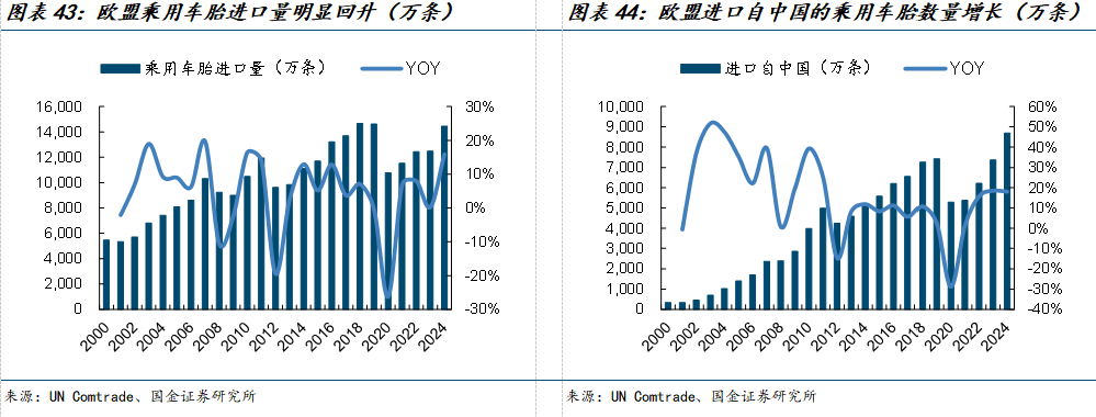 欧盟乘用车胎进口需求支撑较强,对我国的进口依赖度较高。从欧盟整体进口情况来看,2007年之前乘用车胎进口量快速增长,从2000年的5469万条提升至2007年的1亿条,2008年在金融危机影响下进口量有所回落,直至2013年期间进口量基本在1亿条左右波动,然后再次进入增长期,从2014年的1.1亿条持续提升至2018年的1.47亿条,2020年进口量显著回落是因为英国脱欧导致的,持续排除英国脱欧影响,自2013年开始进口量基本一直呈现出增长趋势,2024年乘用车胎进口量同比增长16%达到1.45亿条。从进口自中国的乘用车胎变化来看,2011年之前呈现出快速增长的态势,进口量从2000年的338万条增长至2011年的4983万条,年均复合增速达到28%,2012年阶段性回落后再次进入增长期,从2012年的4246万条提升至2019年的7432万条,英国脱欧后,进口自中国乘用车胎从2020年的5294万条提升至2024年的8694万条。从欧盟乘用车胎进口地区结构来看,2024年进口自中国的数量比例高达60%。