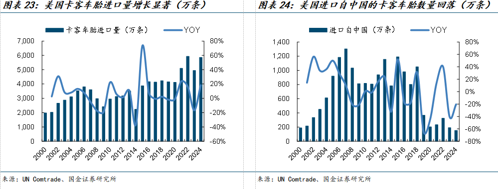 美国卡客车轮胎进口需求震荡向上,贸易政策限制下进口自中国轮胎数量大幅下滑。从美国过去20年的进口趋势来看,2006年之前呈现出稳步增长的趋势,随着金融危机到来进口量也开始回落,2010年重新开始步入增长期,仅有2014年出现阶段性回落后整体进口量基本稳定在4000万条出头的水平,2021年开始随着全球轮胎行业供应链的重构,美国进口量出现显著增长,从2020年的4121万条提升至2024年的5860万条。从进口自中国的卡客车胎变化来看,2007年之前呈现出快速增长的态势,进口量从2000年的188万条增长至2007年的1303万条,年均复合增速达到32%。2008-2018年期间进口量呈现区间震荡的状态,其中2016年美国对我国卡客车胎进行了双反立案调查,也导致2016-2017年连续2年进口量下滑,从2015年时的1191万条下滑至2017年的801万条,但由于2017年2月产业损害终裁结果为否定性,并未对我国实施双反税令,因而2018年进口量快速回升至1000万条以上。但随着2019年2月美国商务部正式对我国卡客车胎征收双反税,进口自我国的卡客车轮胎数量开始大幅下滑,2019年进口量同比下滑65%至367万条,近两年进口量已经下滑至200万条以下。从美国卡客车胎进口量地区占比来看,2007年时进口自中国的占比高达36%,在2015年时仍然维持在30%以上,随着双反调查开始占比在2017年下滑至19%,2018年阶段性回升至25%,2019年开始正式征收双反税后占比快速下滑至9%,2024年时占比已经下滑至3%。