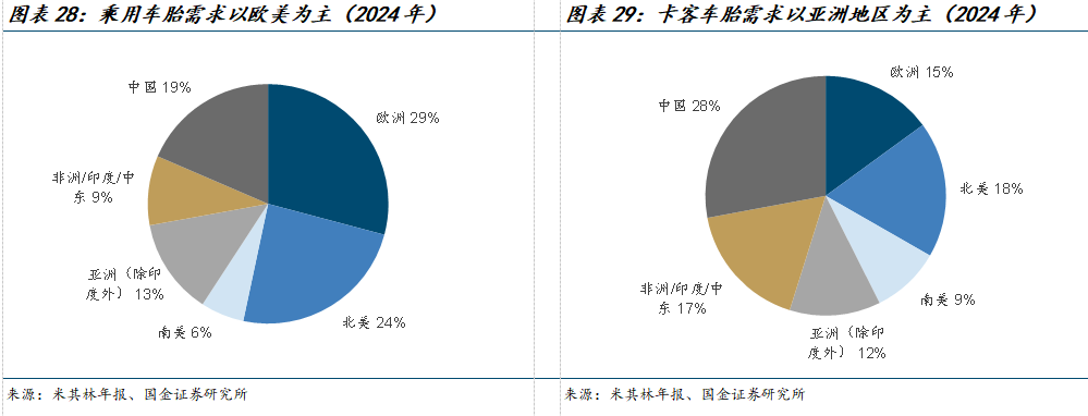 欧洲为全球最大的乘用车胎消费市场。从全球轮胎市场需求分布来看,2024年全球乘用车胎需求16.4亿条,乘用车胎的消费与出行需求和经济发展程度相关,因而欧美为核心消费市场,其中欧洲市场需求为4.8亿条,占比高达29%;北美市场需求为4亿条,占比为29%;2024年全球卡客车胎需求为2.1亿条,卡客车胎和基建领域需求关联度更高,因而发展中国家和地区的需求量更高,核心的消费市场为亚洲地区,欧洲地区消费量仅有3150万条,占比为15%。