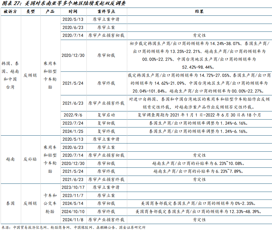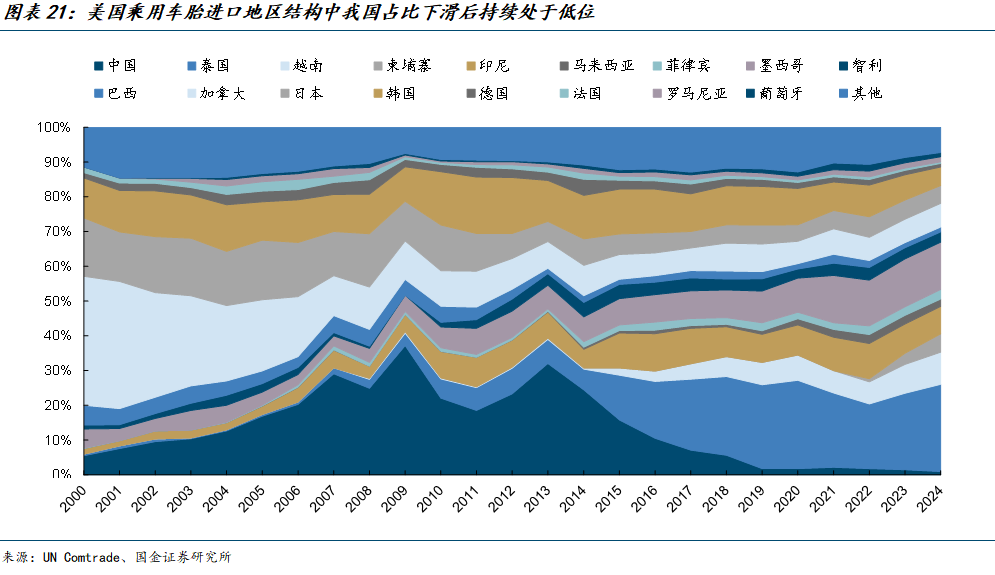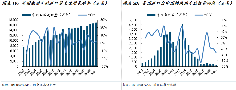 美国乘用车轮胎进口需求支撑力度较强,在多重贸易救济措施打击下进口自中国轮胎数量显著回落。从美国整体进口情况来看,2024年乘用车胎进口量同比增长2%达到1.69亿条,过去20年期间的进口量呈现出增长趋势,其中2009年在金融危机影响下美国轮胎整体需求和进口需求都显著下滑,根据米其林年报数据,2009年北美乘用车和轻卡胎原配市场同比下滑32.3%,替换市场同比下滑2.3%;在需求支撑不足的背景下,美国乘用车胎进口量同比下滑27%,从1.38亿条下滑至1亿条出头。从进口自中国的乘用车胎变化来看,2009年之前呈现出快速增长的态势,进口量从2000年的412万条增长至2009年的3741万条,年均复合增速达到28%。2009年9月开始美国对我国实施长达3年的限制关税,因而进口自中国的乘用车胎数量持续下滑,在2011年时降低至2238万条,相比2009年时的进口量下滑了40%。随着特保案关税影响的逐渐消退,美国进口自我国的乘用车胎数量显著回升,在2013年达到了4604万条,但由于2014年美国对我国乘用车胎发起双反,且裁定税率较高导致进口量快速下滑,在2020年时降低至248万条,相比2013年时的进口量下滑了95%。2020年至今美国进口自中国的乘用车胎数量一致处于低位波动的趋势。从美国乘用车胎进口地区结构变化来看,2009年时进口自中国的占比高达37%,在2011年时阶段性降低至19%后在2013年时回升至32%,然后占比开始快速下滑,2019年时占比仅为2%。