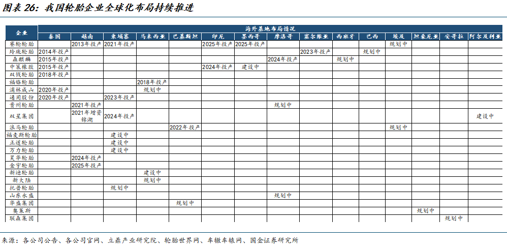 欧盟反倾销背景下,具备海外产能增量的龙头胎企将持续受益。2017年欧盟对我国卡客车胎发起双反调查,随着我国胎企东南亚基地产能爬坡放量,欧盟进口自泰国的卡客车胎数量从2018年的93万条提升至2024年的277万条,占比从6%提升至13%;进口自越南的卡客车胎数量从2018年的16万条提升至2024年的152万条,占比从1%提升至7%;中泰越三国的进口占比在2024年仍然高达56%。2025年5月21日,欧盟对我国乘用车和轻卡胎发起反倾销调查,初裁实施时间预计在2026年1月,并且设置3个月的追诉期。2024年欧盟乘用车胎进口量同比增长16%达到1.45亿条,进口自中国的数量为8694万条,占比高达60%。若本次欧盟反倾销裁定税率较高,考虑到短期供应紧缺且海外产能扩建周期相对较长,预计未来2-3年海外产能出口欧盟订单将会具备较好的涨价弹性和盈利空间,头部胎企也能把握机会进一步扩大全球市占率。