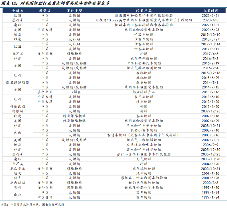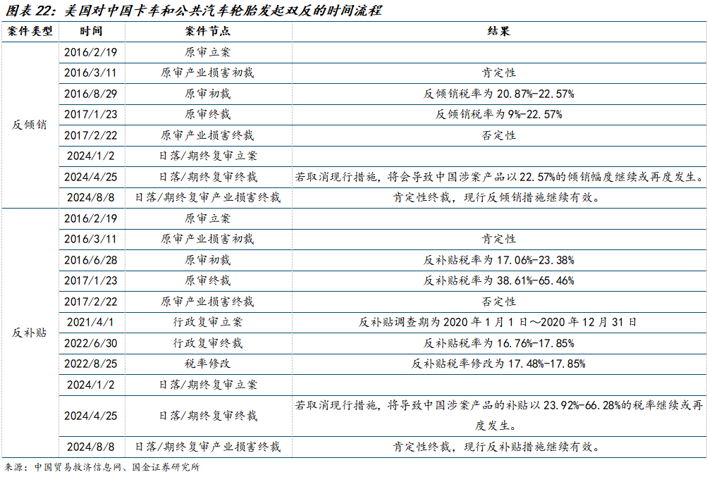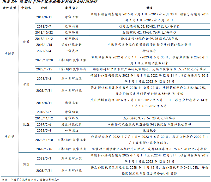 欧盟对我国卡客车轮胎发起双反调查,复审后相关限制措施延续至今。2017年8月11日,欧盟委员会对原产中国的全新或翻新卡客车轮胎进行反倾销和反补贴立案调查。2018年5月7日,裁定临时反倾销税52.85-82.17欧元/每单位;2018年10月22日,反倾销税终裁结果为42.73-61.76欧元/每单位;2018年11月12日,反倾销税修改为0-39.98欧元/每单位,反补贴税为3.75-57.28欧元/每单位。2019年1月15日与2月6日,中橡协代表企业向欧盟普通法院分别提交反倾销终裁起诉书和反补贴终裁起诉书,指出欧委会在“双反”终裁中存在的若干事实认定和法律适用错误,请求欧盟普通法院撤销“双反”税令。2019年底中橡协向欧盟普通法院提交申请,请求就本案进行庭审,2020年初至2021年初本案程序暂缓。2022年5月4日,欧盟普通法院公布了一审裁决,最终判决完整撤销欧委会有关对华卡客车轮胎的“双反”税令,撤销效果覆盖提出诉讼的企业。直至2023年10月和11月陆续开始反倾销和反补贴的期终复审立案,在2025年时最后终裁结果仍然维持了0-35.74欧元/每单位的反倾销税和3.75-57.28欧元/每单位的反补贴税。