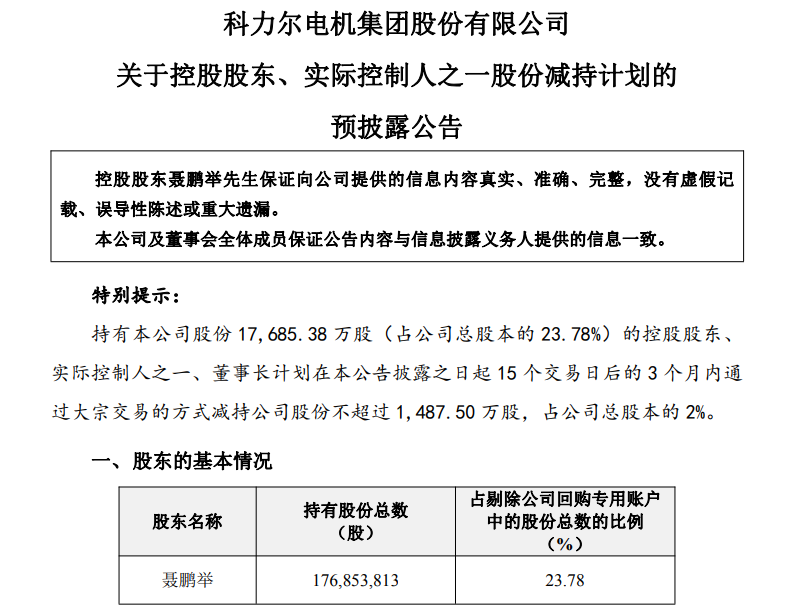 9月29日,科力尔(002892.SZ)发布公告,公司控股股东、实际控制人之一、董事长聂鹏举计划在本公告披露之日起15个交易日后的3个月内通过大宗交易的方式减持公司股份不超过1487.50万股,占公司总股本的2%。