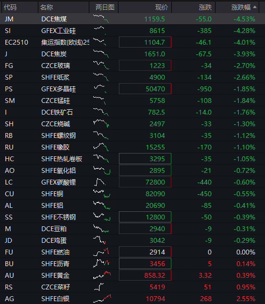 商品:国内商品期货普跌,截至发稿,焦煤、工业硅、集运指数跌超4%,焦炭跌超3%,玻璃、纸浆跌超2%,多晶硅、锰硅、铁矿石、烧碱、螺纹钢、橡胶、热卷板等跌超1%,氧化铝、碳酸锂、铜、铝、不锈钢、豆粕、鸡蛋等下跌,沥青、沪金、菜籽等少数品种走高,沪银涨近3%。