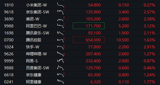 科网股反弹,京东健康高开2%,京东健康涨超2%,携程涨近2%,ASMPT、小米、京东、中芯国际、华虹半导体等涨超1%;贵金属续涨,紫金矿业涨3%。