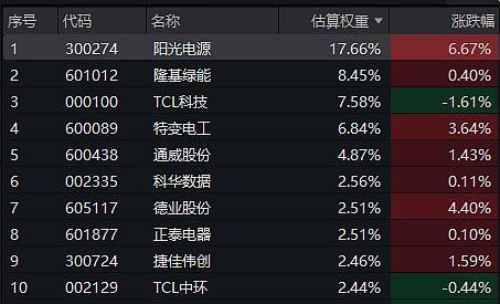 相关成分股:$阳光电源(300274)、$隆基绿能(601012) 、$TCL科技(000100)、$特变电工(600089) 、$通威股份(600438)、$正泰电器(601877)、$TCL中环(002129)、$德业股份(605117)、$晶科能源(688223)、$晶澳科技(002459) (成分股仅做展示使用,不构成投资建议)