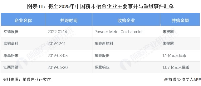 中国粉末冶金行业主要是大型上市企业对中型粉末冶金生产企业进行并购,如Powder Metal Goldschmidt并购立德股份、东睦股份并购华晶粉末等。总体来看中国粉末冶金行业并购事件数量较少,截至2024年中国粉末冶金行业兼并与重组事件如下所示: