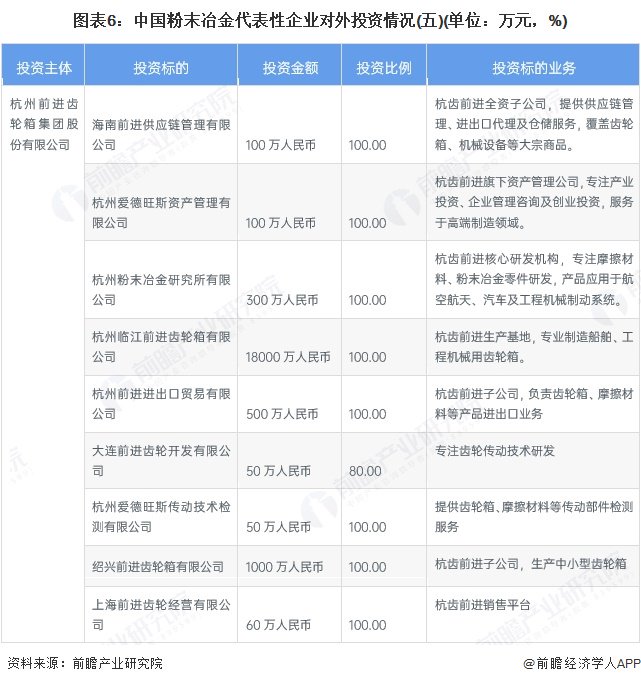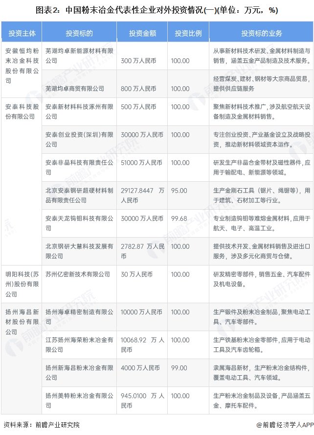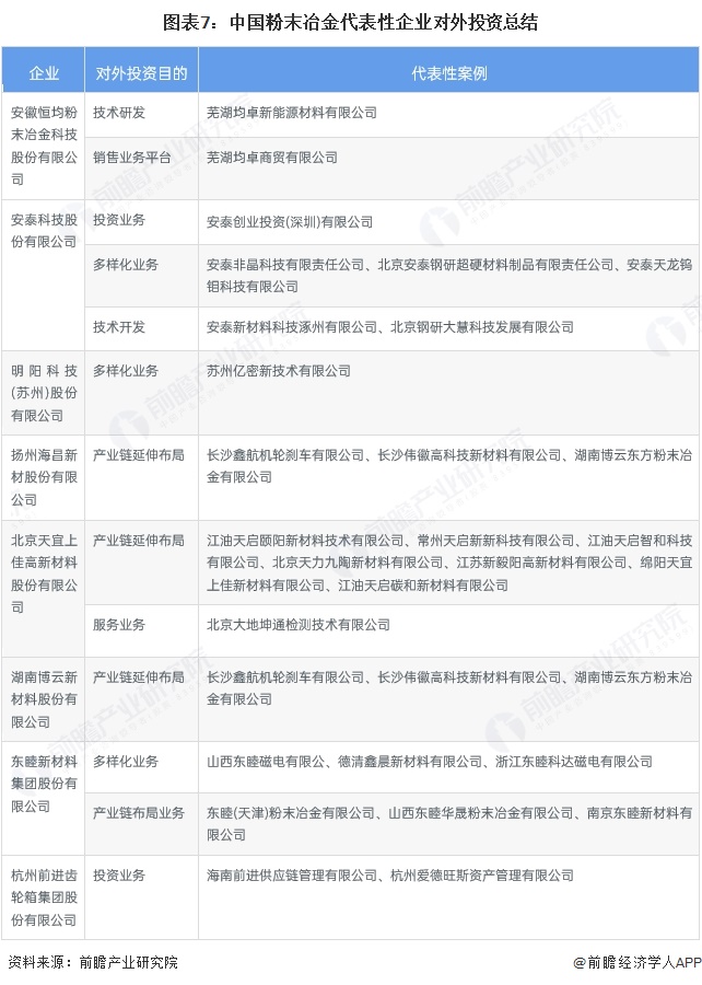 从中国粉末冶金代表性企业的对外投资来看,粉末冶金企业对外投资的企业数量较多,多以设立子公司产业链业务延伸为主。