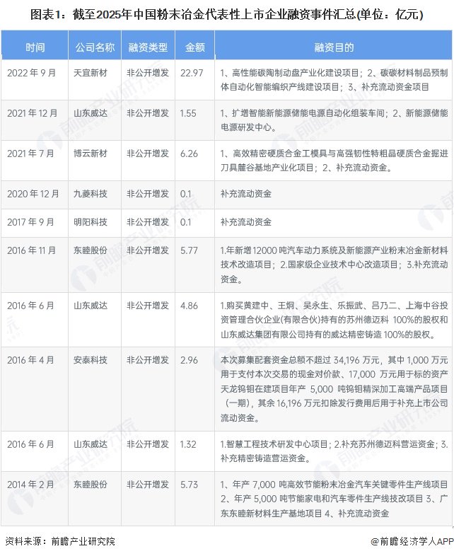 根据代表性上市企业公告的梳理,粉末冶金行业的上市公司融资手段主要通过定向增发方式进行。从整体来看,我国粉末冶金上市企业融资目的主要是用于扩增业务产线和补充流动资金等。截至2025年中国粉末冶金行业代表性上市企业主要的融资事件如下: