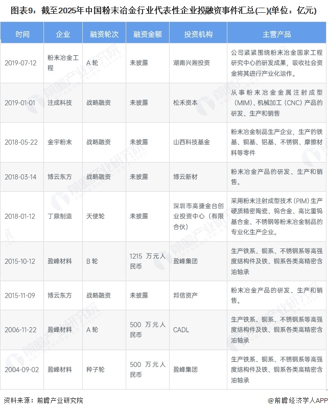 从中国料机械设备行业投融资事件汇总中可以看出,整体来看粉末冶金行业的投融资热度较低。截至2025年6月以来中国粉末冶金行业投融资事件汇总如下: